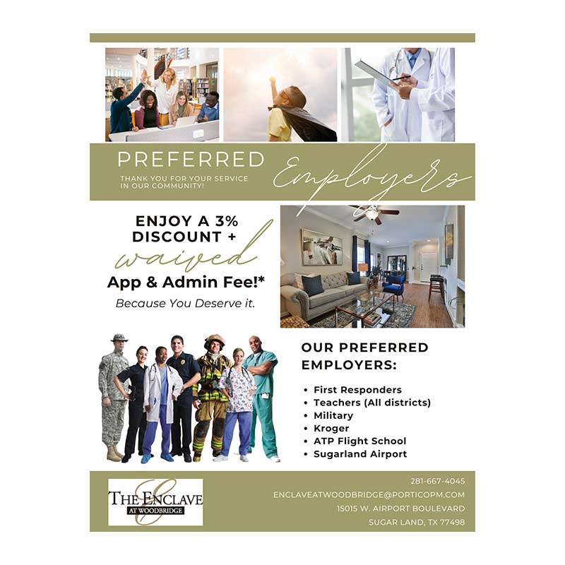 Blending comfort, style, and modern convenience, The Enclave at Woodbridge Apartments in Sugar Land, Texas stands as a premier rental community offering thoughtfully designed one, two, and three-bedroom apartments. Nestled in a vibrant area, our community is just moments away from shopping, dining, and entertainment options, making it the perfect place to call home. Experience all that Sugar Land has to offer at The Enclave at Woodbridge, where premium living and everyday convenience come together. Discover your perfect home today in one of Texas’ most desirable locations.